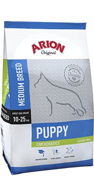 Arion Original Puppy Medium Breed Chicken & Rice to karma stworzona specjalnie dla szczeniąt średnich ras, o wadze dorosłego psa wynoszącej od 10 do 25 kg. Ta dieta uwzględnia unikalne potrzeby rosnących szczeniąt średnich ras, zapewniając im zdrowe i zbilansowane pożywienie.