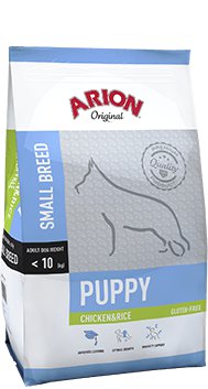 Arion Original Puppy Small Breed Chicken and Rice to kompletna karma dla szczeniąt małych ras, która jest bezglutenowa i nie zawiera żadnych produktów z kukurydzy czy innych zbóż. Dzięki temu ARION Original minimalizuje ryzyko wystąpienia zaburzeń nawet u najbardziej wrażliwych szczeniąt.