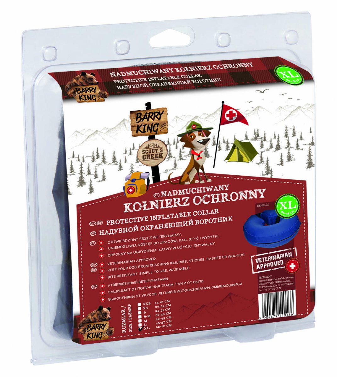 Ochronny, weterynaryjny kołnierz nadmuchiwany marki Barry King, przeznaczony jest dla zwierząt po przebytych zabiegach chirurgicznych. Produkt wykonany z pokrowca zapinanego na suwak. Ważną zaletą produktu są szlufki, które pozwalają na zamocowanie go do obroży. Kołnierz nie ogranicza widoczności i ruchów zwierzęcia, a materiał z którego jest wykonany jest bezpieczny dla mebli (nie rysuje ich powierzchni). Zatwierdzony przez lekarzy weterynarii.