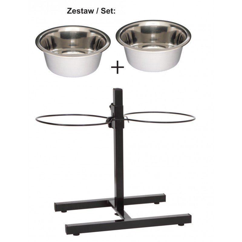Wysokiej jakości zestaw dwóch misek ze stali nierdzewnej na stojaku o regulowanej wysokości. Idealne rozwiązanie dla psów – miski dzięki prawidłowemu ustawieniu do wysokości psa, wpływają pozytywnie na trawienie. Miski można ustawić na dowolnej wysokości tak aby nie nadwyrężać kręgosłupa psa. Miski są w różnych rozmiarach.