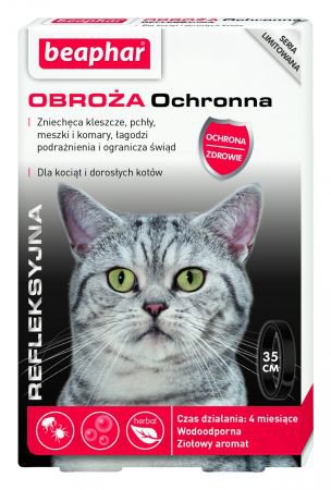 OBROŻA BEA naturalna, zapachowa, refleksyjna, dla kociąt i kotów to produkt zawierający wyjątkowo aromatyczną kompozycję naturalnych olejków, które wykazują działanie łagodzące oraz przeciwświądowe na skórę zwierzęcia, dzięki czemu świetnie sprawdzi się ona w przypadku pogryzień przez owady, podrażnień skóry czy nadmiernego drapania się zwierzęcia. Obroża nadaje ziołowy, świeży zapach, który jest nieatrakcyjny dla pasożytów. Dlatego można używać jej jako wspomaganie działania kropli, szczególnie w sytuacji gdy zawiedzie ludzka pamięć. Tak łatwo bowiem przeoczyć comiesięczną aplikację kropli. Siła obroży tkwi w odpowiednio dobranej kompozycji olejków eterycznych które działają w sposób sumujący się, a ich działanie jest równomierne aż do 4 miesięcy. Odbija światło zapewniając kotu widoczność i bezpieczeństwo.