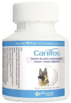 Tabletki dla psów wzmacniające na wzrost i rozwój organizmu. Obecne w preparacie makroskładniki mineralne uzupełnione w pierwiastki śladowe tworzą harmonijną kompozycję wpływającą regulująco na wzrost i rozwój organizmów. Dostarczają składników decydujących o prawidłowej budowie i osiąganej wytrzymałości kości. CANIFOS zaleca się podawać wszystkim psom, szczególnie przy stosowaniu pożywienia nie zawierającego wystarczającej ilości składników mineralno-witaminowych.