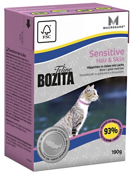 Karma Bozita Feline Funktion Sensitive Hair & Skin charakteryzuje się wysoką zawartością mięsa (93% mięsa w każdym kawałku), co zapewnia jej lekkostrawność oraz naturalne proporcje witamin i minerałów. Karma ta jest bogata w witaminy z grupy B i zawiera mięso łososia skandynawskiego, zapewniając optymalny poziom kwasów tłuszczowych omega-3 i -6, które tworzą solidną podstawę dla utrzymania w dobrym stanie skóry i sierści kota. Karma jest naturalnie bogata w selen i taurynę, zawiera również MacroGard®, naturalny β-glukan, który wzmacnia układ odpornościowy kota.