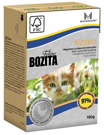 Kawałki w galaretce Bozita Feline Funktion Kitten to pełnowartościowa pod względem odżywczym i odpowiednio zbilansowana mokra karma zawierająca SPC, która ułatwia przechodzenie od mleka do stałych pokarmów i jest przeznaczona w szczególności dla kociąt i młodych kotów.