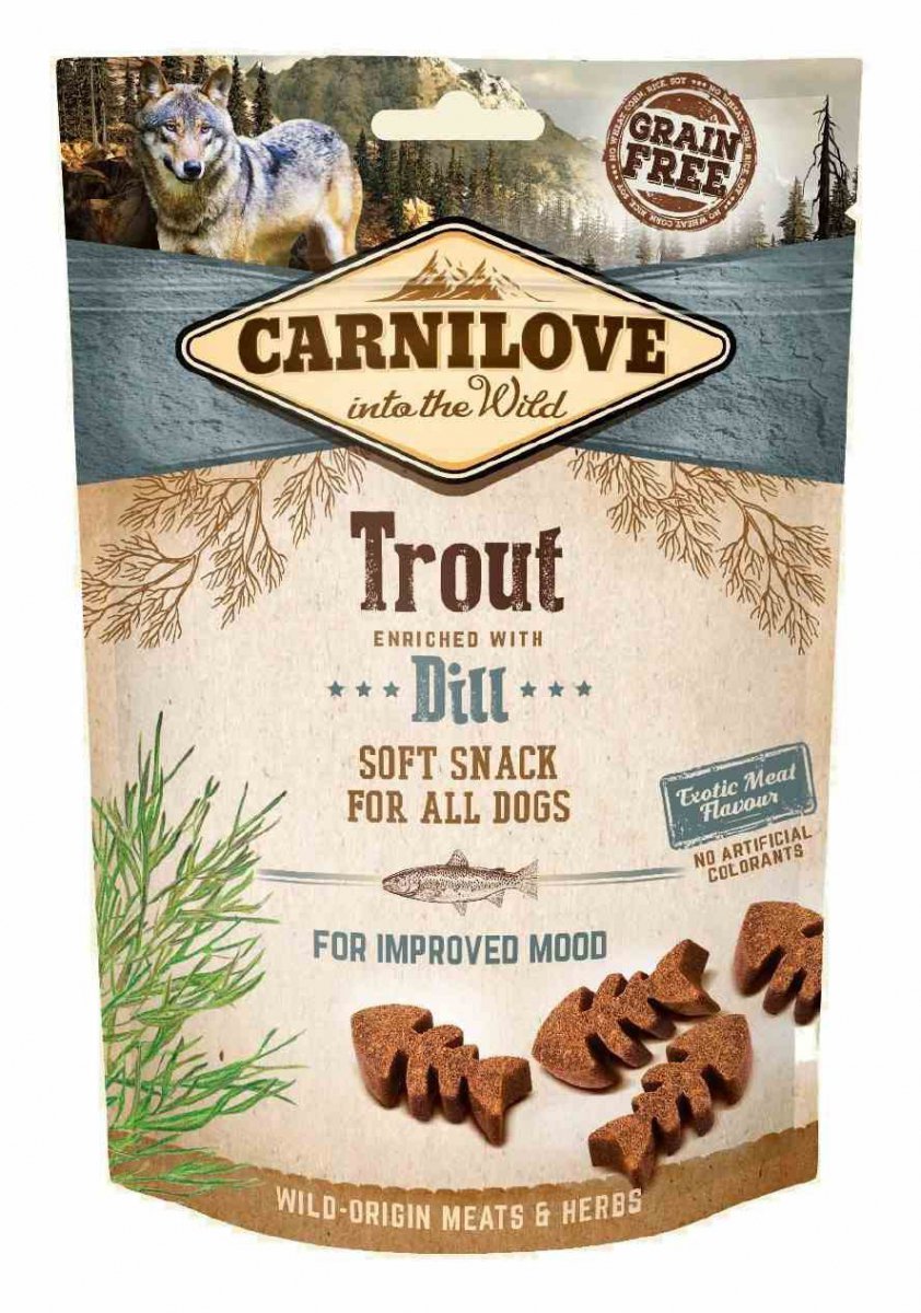 CARNILOVE Dog Semi Moist Snack Trout with Dill to pyszna, miękka przekąska dla wszystkich psów, która zachwyci nawet najbardziej wymagające podniebienia. Nasza przekąska zawiera wyjątkowy składnik - pstrąg i koperek - które mają pozytywny wpływ na nastrój Twojego psa.