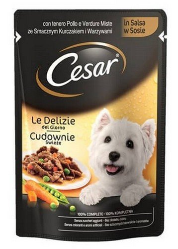 Posiłki Cesar komponowane są z dbałością o szczegóły tak starannie, żeby zadowolić nawet najbardziej wymagające psy. Zwrócono przy tym specjalną uwagę na zawartość odpowiedniego poziomu substancji mineralnych i aminokwasów, zapewniając pełnowartościowy odżywczy pokarm. Pyszny sos, w którym zatopione są warzywa i kawałki kurczaka z pewnością usatysfakcjonują każdego psiego smakosza, dając mu jednocześnie radość i siłę na kolejny dzień. Nie zawiera sztucznych barwników i aromatów.