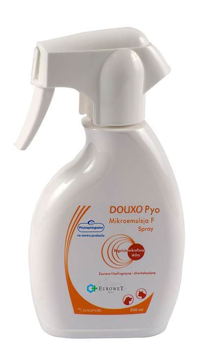 - DOUXO PYO Mikroemulsja F jest dermokosmetykiem weterynaryjnym o działaniu ułatwiającym utrzymanie prawidłowej mikroflory skóry oraz przeciwłojotokowym.