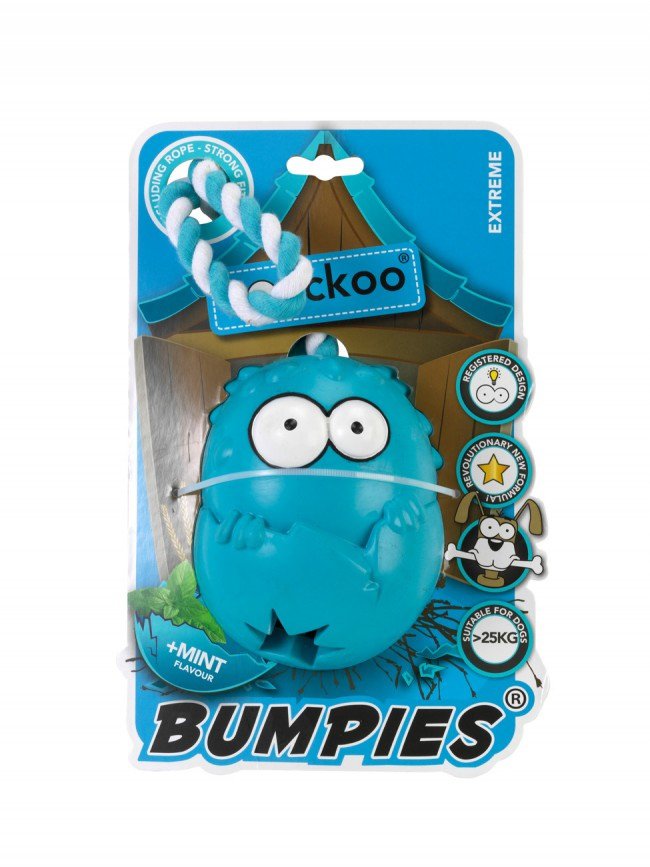 Bumpies to zabawka w kształcie jajka, która dzięki swojemu nieregularnemu kształtowi odbija się w nieprzewidywalny sposób, co umożliwia wspaniałą zabawę czworonogowi, a dzięki wytrzymałej lince zabawka idealnie spełni rolę szarpaka. Dwa otwory umozliwiają włożenie ulubionych przysmaków pupila aby zachęcić go do samodzielnej zabawy. Czynność ta oprócz rozrywki, świetnie rozwija zdolności psa, gdyż musi się nie lada nagłowić aby dostać się do swojego smakowitego kąska. Ponadto kuszący zapach zabawki jeszcze bardziej zaintersuje naszego czwronoga.