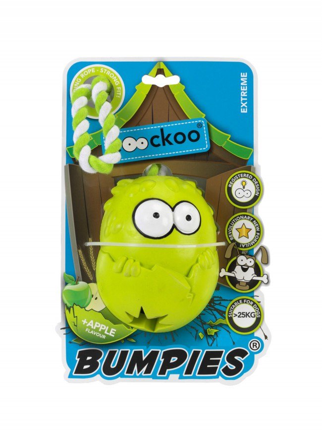 Bumpies to zabawka w kształcie jajka, która dzięki swojemu nieregularnemu kształtowi odbija się w nieprzewidywalny sposób, co umożliwia wspaniałą zabawę czworonogowi, a dzięki wytrzymałej lince zabawka idealnie spełni rolę szarpaka. Dwa otwory umozliwiają włożenie ulubionych przysmaków pupila aby zachęcić go do samodzielnej zabawy. Czynność ta oprócz rozrywki, świetnie rozwija zdolności psa, gdyż musi się nie lada nagłowić aby dostać się do swojego smakowitego kąska. Ponadto kuszący zapach zabawki jeszcze bardziej zaintersuje naszego czwronoga.