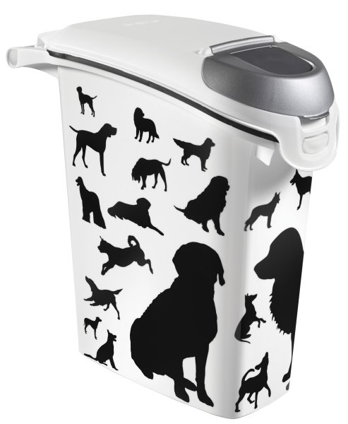 Pojemnik na karmę dla psa. Posiada wygodne uchwyty ułatwiają przenoszenie oraz napełnianie pojemnika. Dzięki małej pokrywce z funkcją blokowania, możliwe jest napełnianie miski bez rozsypywania karmy. Szczelne zamknięcie z gumową uszczelką zapobiega wydostawaniu się zapachu zawartości na zewnątrz. Posiadacze czworonożnych przyjaciół docenią hermetyczne zamknięcia, dzięki którym pożywienie pozostaje długo świeże. Wyposażony jest również w specjalne zamki uniemożliwiające nadprogramowy poczęstunek futrzanego głodomora. Z przodu pojemnika znajduje się wzmocniony uchwyt. Istnieją dwie możliwości wyjęcia porcji karmu. Pierwsza poprzez otworzenie pokrywy głównej pojemnika, (tam gdzie znajduje się zielona uszczelka), druga poprzez poręczną mała pokrywę zamontowaną w pokrywie głównej. Eleganckie, neutralne i nowoczesne wzornictwo sprawiają, że pojemnik będzie pasował do wystroju każdego pomieszczenia.