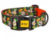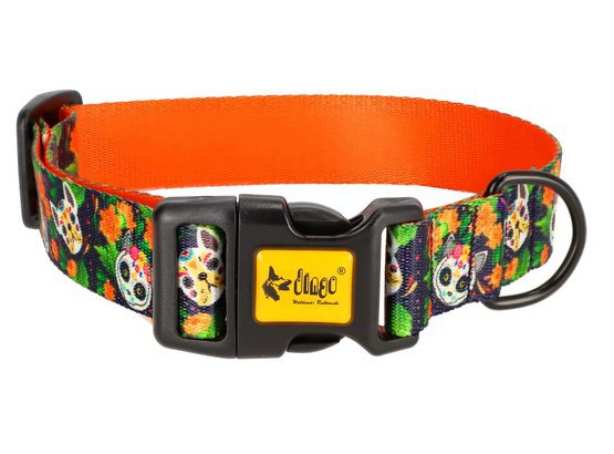 Pomarańczowe kwiaty aksamitek, którymi ozdabiane są domy i cmentarze z okazji Dia de los muertos wyraziście odbijają się na ciemnogranatowej obroży. Wzór został wykończony motywem zwierzęcych calaveras, czyli bogato zdobionych, meksykańskich czaszek.