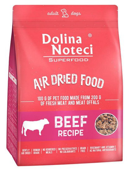 Dolina Noteci Superfood Air Dried Beef Recipe to wyjątkowa karma suszona, stworzona specjalnie dla dorosłych psów wszystkich ras, której głównym składnikiem jest wartościowa wołowina. Ta pełnoporcjowa karma w pełni zaspokaja potrzeby żywieniowe Twojego pupila, dzięki starannie dobranym i bogatym w składniki odżywcze surowcom.