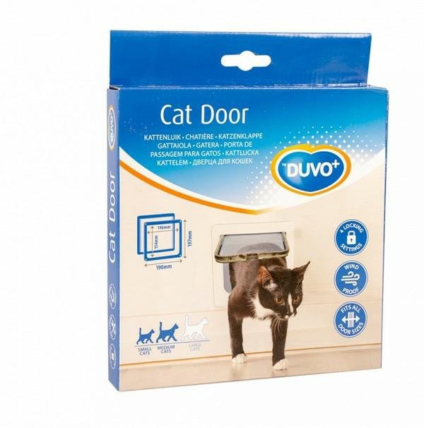 Przezroczysta klapa dla kota Duvo + ma białą ramkę i jest wykonana z wytrzymałego, odpornego na warunki atmosferyczne tworzywa sztucznego. Cztery ustawienia oferują Ci i Twojemu kotu wiele różnych opcji. Możesz zamknąć drzwi dla kota w obu kierunkach lub otworzyć w obu kierunkach, lub otworzyć tylko w jednym kierunku, aby Twój kot mógł wyjść lub wejść. Klapa dla kota ma samozamykające się urządzenie magnetyczne, dzięki czemu zawsze dobrze się zamyka i nie pozostawia miejsce dla przeciągów w domu. Ten model jest odpowiedni dla małych i średnich kotów. Sprawdź wcześniej, czy wymiary pasują do Twojego kota. Regulowany tunel nadaje się do ścian i drzwi o grubości do 50 mm. Aby ułatwić instalację, klapa dla kota posiada papierowy szablon. Wystarczy przykleić szablon do drzwi i wyciąć naokoło.