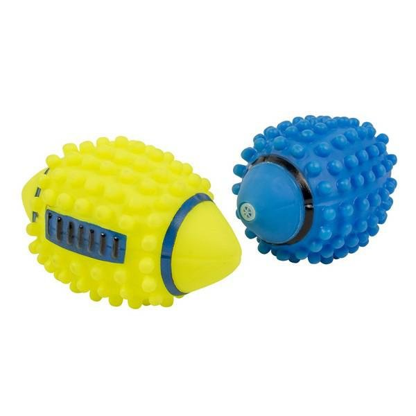 Wytrzymała chropowata zabawka w postaci piłki do rugby.