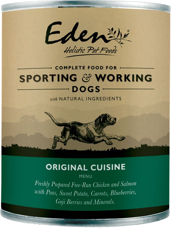 Karma mokra dla psa stworzona tylko z najlepszej jakości składników. Pełnoporcjowa karma Eden stworzona została ze świeżego, angielskiego kurczaka z wolnego wybiegu oraz ze szkockiego łososia. Dodatkowo została wzbogacona o warzywa takie jak: bataty, marchewka. Resztę stanowią owoce jagód oraz witaminy i minerały. Karma dla psa bez zbóż. Posiada w swoim składzie aż 70% wysokobiałkowego mięsa. Źródłem węglowodanów są owoce i warzywa. Eden Original Cuisine zawiera w swoim składzie dodatek suplementów oraz probiotyki wpływające na odpowiednią pracę układu trawiennego. Nie zawiera w swoim składzie żadnych wypełniaczy, barwników oraz konserwantów. Karma nie zawiera zbóż pod żadną postacią, brak ryżu i ziemniaków. Posiada w swoim składzie zioła wpływające na ogólną, dobrą kondycję kota. Zawarty w karmie dodatek chondroityny oraz glukozaminy zapewni kotu zdrowy układ kostny. Dodatki wpływają również bardzo dobrze na stawy psa. Jest to wysokiej jakości karma. Psy ze względu na swój pierwotny instynkt, jakim jest łowiectwo, bardzo dobrze przyswajają karmę z dużą zawartością mięsa. Karma jest smakowita i łatwoprzyswajalna.
