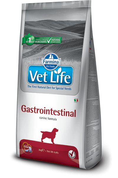 Farmina Vet Life Gastro-Intestinal to lekkostrawne pożywienie, które pomaga przywrócić naturalną mikroflorę i mikrofaunę jelit oraz chroni błonę śluzową jelit dzięki zawartości rozpuszczalnego błonnika. Ta lekkostrawna karma jest również zalecana psom o ograniczonej aktywności enzymatycznej trzustki, jak również psom cierpiącym na ostre zapalenie trzustki (nie hiperlipidemiczne) po początkowym stadium, kiedy pies zaczyna przyjmować karmę i wodę. Ta lekkostrawna karma jest również wskazana, aby ograniczyć ilość jedzenia potrzebnego do utrzymania psa w przypadku rozszerzonego żołądka i torsji. W takich przypadkach należy podawać psu niewielkie ilości karmy 6 razy dziennie.