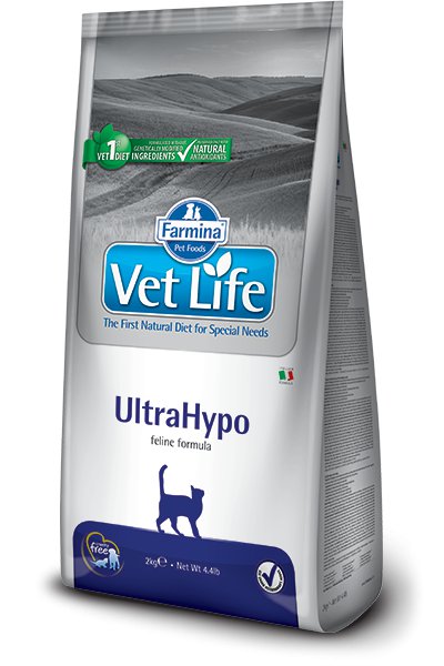 Farmina Vet Life UltraHypo jest kompletnym dietetycznym pożywieniem dla kotów cierpiących na nieporządane reakcję na żywność ( alergii i / lub nietolerancję ). Może być pomocna w diagnozowaniu ( dieta eliminacyjna ) Zaleca się w przebiegu przewlekłych chorób zapalnych jelit ( IBD ) oraz przy częstych nawracających wymiotach.