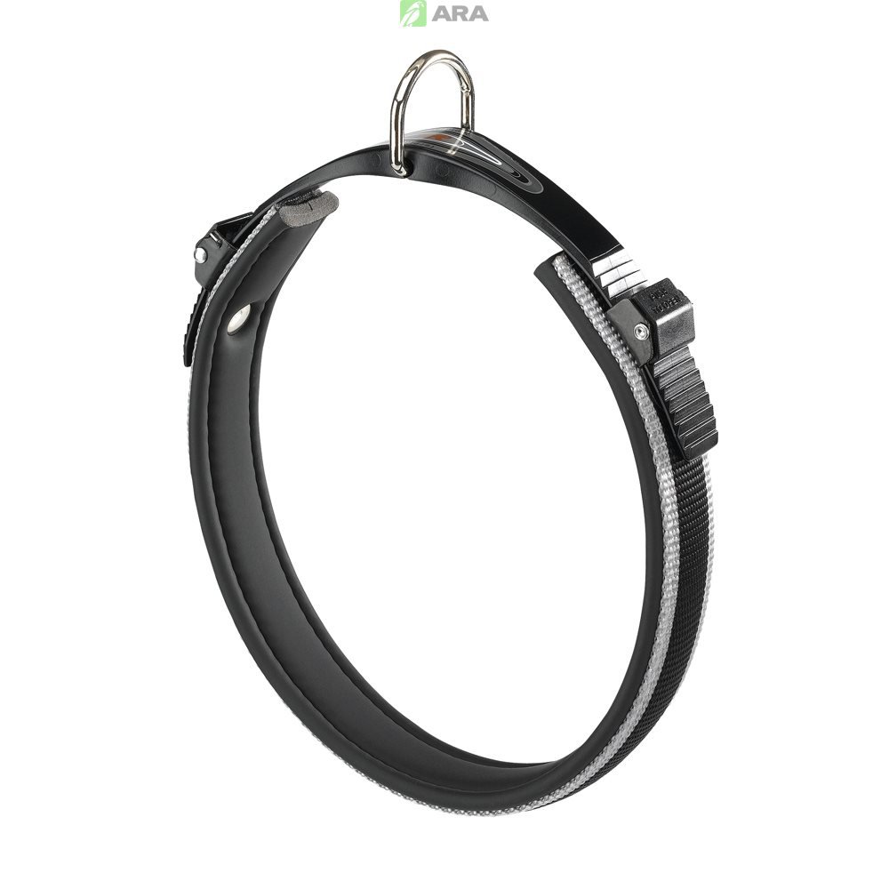 Regulowana obroża z miękkim podbiciem o nowoczesnych zapięciach ( jak w butach narciarskich) umożliwiających bardzo precyzyjne dopasowanie obroży do psa i łatwe jej ściągnięcie .