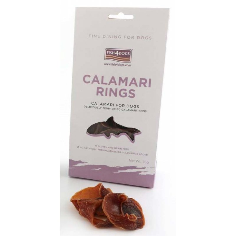 Fish4dDogs Calamari Rings to bogate w morskie źródło kwasów Omega-3, Krążki z Kalmarów są idealne dla zdrowej, błyszczącej sierści i elastycznych stawów. Stanowią cenne źródło pełnowartościowego, łatwo przyswajalnego i wysoce strawnego białka o niskiej zawartości tłuszczów nasyconych i cukrów. Posiadają dużą ilość witamin z grupy B, jodu, selenu i fluoru. Mają również żelazo, cynk i magnez. Są nie tylko zdrowe, ale i smaczne