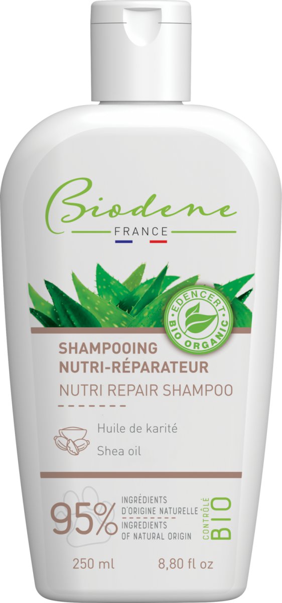 Szampon odżywczo-naprawczy wzbogacono o olej shea, który nawilża bardzo suchą lub zniszczoną sierść oraz w betainę, posiadającą właściwości wzmacniające suchą skórę.