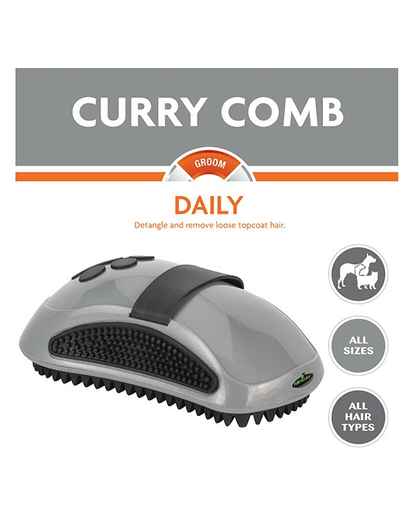 Zgrzebło Furminator Curry Comb pomaga zachować zdrową, błyszczącą i gładką sierść zwierzęcia, rozprowadzając naturalne natłuszczenie po skórze i sierści. Należy stosować codziennie przez 5-10 minut jednorazowo.