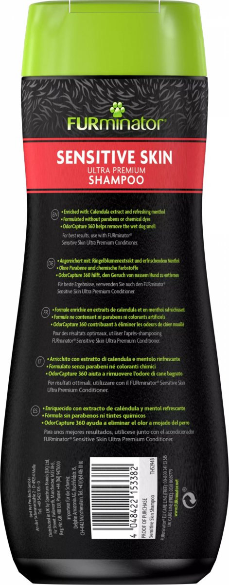 Szampon dla psów FURminator® Sensitive Skin Ultra Premium Shampoo dowodzi swojej doskonałej skuteczności w zakresie oczyszczania wrażliwej skóry podczas każdej kąpieli zwierzaka. Dzięki składnikom nawilżającym i czynnikom chłodzącym łagodzi świąd spowodowany suchą skórą. Specjalna formuła dla psów o suchej, wrażliwej skórze nawilża skórę zwierzaka i tym samym wzmacnia i odżywia skórę i sierść. Szampon wzbogacony ekstraktem z nagietka i orzeźwiającym mentolem delikatnie pielęgnuje skórę. Innowacyjna technologia OdorCapture 360 pomaga usunąć woń mokrego psa, jednocześnie neutralizując zapachy. Szampon FURminator Sensitive Skin Ultra Premium Shampoo nie zawiera siarczanów, parabenów ani barwników chemicznych i jest idealnym wyborem dla psów o suchej, wrażliwej skórze. Aby uzyskać najlepsze rezultaty, stosuj preparat razem z odżywką FURminator® Sensitive Skin UltraPremium Conditioner.