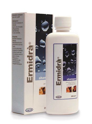 Szampon Ermidra dla psa i kota. Doskonały do skóry wrażliwej i alergicznej. Do częstego stosowania. Preparat o działaniu łagodzącym. Dzięki zastosowaniu glukonianu cynku normalizuje wrażliwość skóry psów i kotów. Zastosowany w szamponie wyciąg z Wierzbówki Kiprzycy (Epilobium angustifolium) posiada właściwości kojące, zmiękczające i przeciwbakteryjne. Ekstrakt z szałwi przywraca skórze jej naturalne właściwości i normalizuje pH.