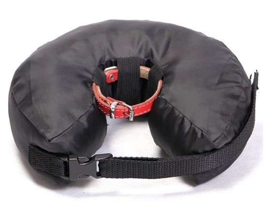 - W wewnętrznej części kołnierza zastosowano szlufki, w które wsuwa się dobrze dopasowaną obrożę i zapina ją na szyi psa lub kota, następnie zapina się rzep ściągając dość mocno kołnierz.