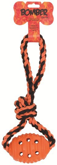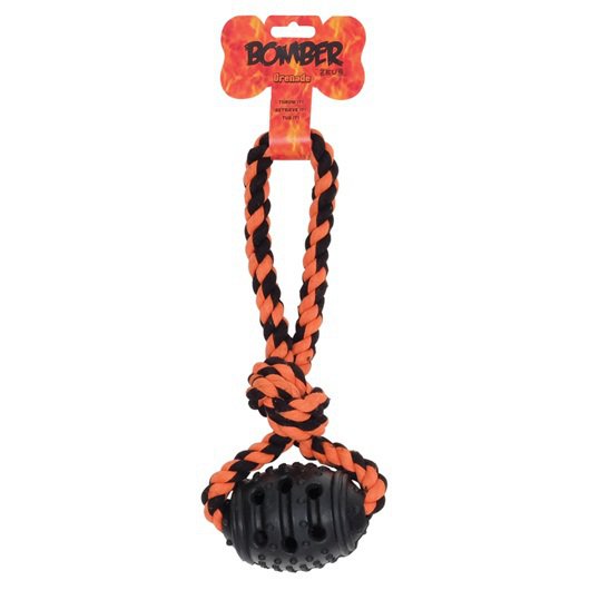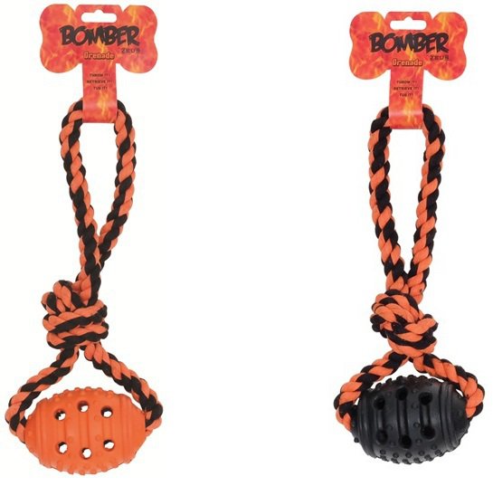 - Gumowy granat na bawełnianym sznurku do zabawy z psem.