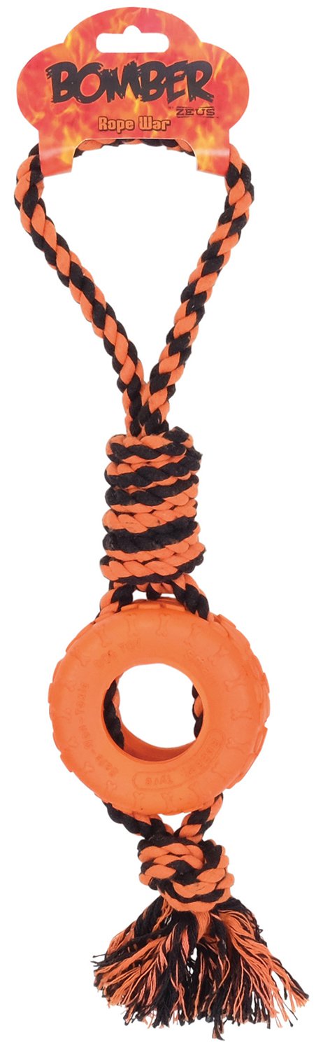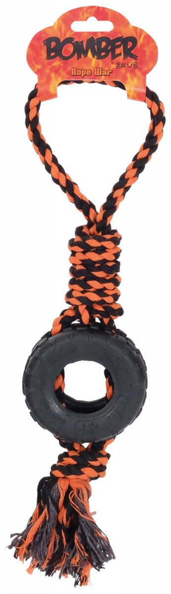 - Zabawka dla psa z elastycznym pierścieniem z gumy i wytrzymałym sznurkiem.