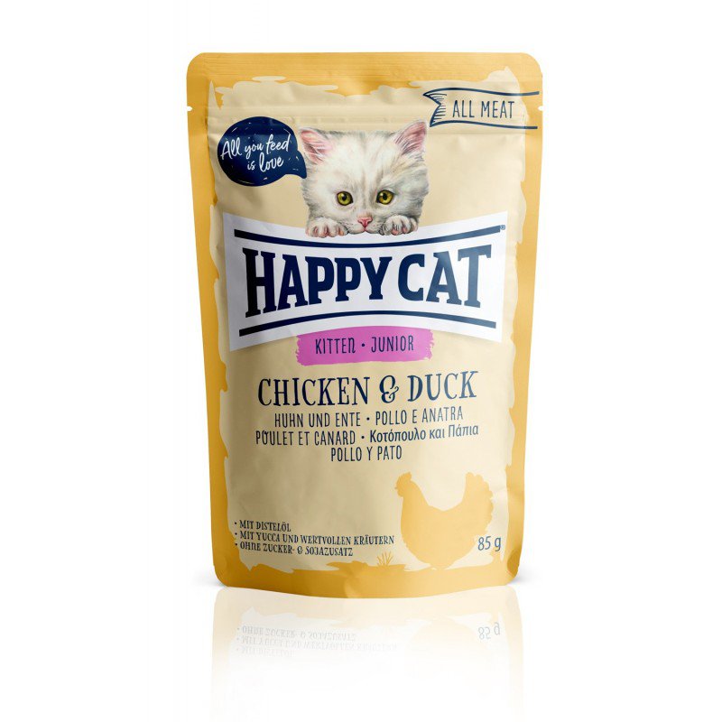 Jako pełne jedzenie, pyszne torebki Happy Cat All Meat zawierają wszystko, czego potrzebuje kotek, aby dobrze rozpocząć życie w kotka. Kocięta w pierwszych miesiącach życia potrzebują dodatkowej energii, aby rosnąć i bawić się. Delikatne, soczyste kawałki odmiany "chicken & duck" rozpieszczają rosnącą aksamitną łapę, a jednocześnie dostarczają jej wszystkiego, aby stała się duża i mocna.