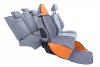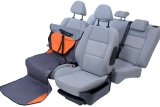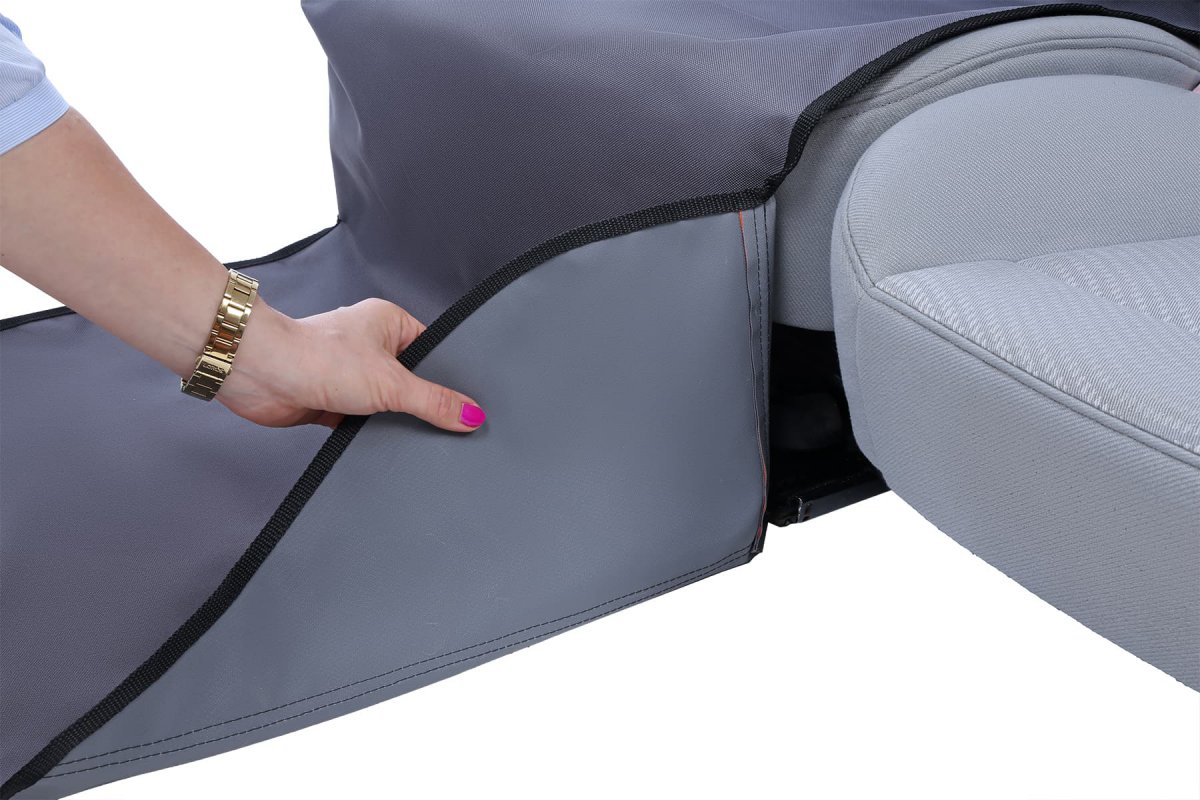 Wygodny montaż: Niezależnie od położenia zagłówków, klamry z regulowanymi paskami umożliwiają łatwe i szybkie zamocowanie maty na fotelu.