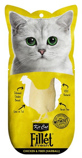 Przysmaki Kit Cat Fillet Fresh to tworzone ze starannie dobieranych i ręcznie przygotowywanych naturalnych składników. Oferują niskotłuszczowe mięso kurczaka lub ryby bogate w kwasy Omega-3 i Omega-6, które przyczyniają się do zdrowia Twojego kota.