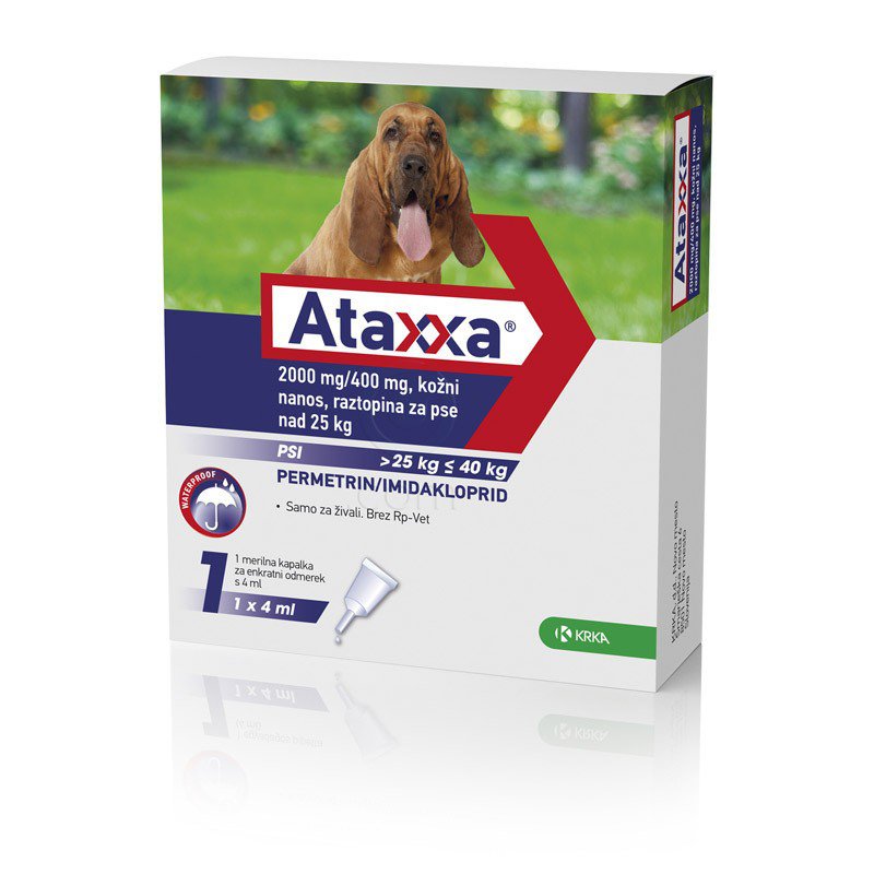 - Ataxxa 2000 mg/400 mg roztwór do nakrapiania dla psów 1 pipeta 4 ml zawiera: Permetryna 2000 mg, Imidaklopryd 400 mg.