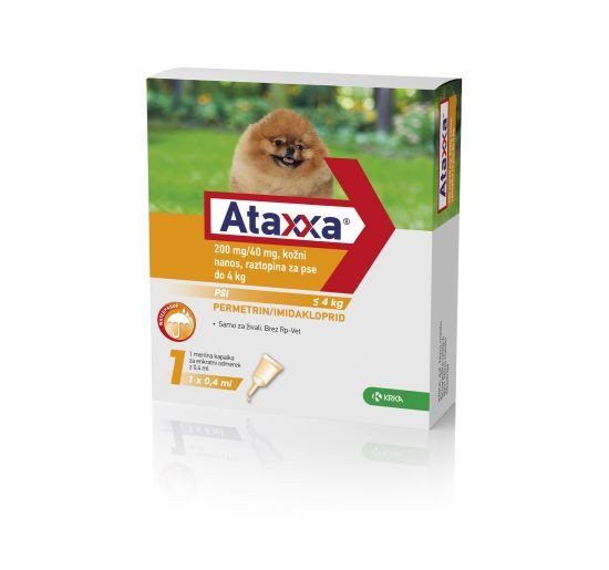 - Ataxxa 200 mg/40 mg roztwór do nakrapiania dla psów 1 pipeta 0,4 ml zawiera: Permetryna 200 mg, Imidaklopryd 40 mg;