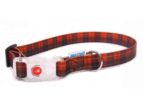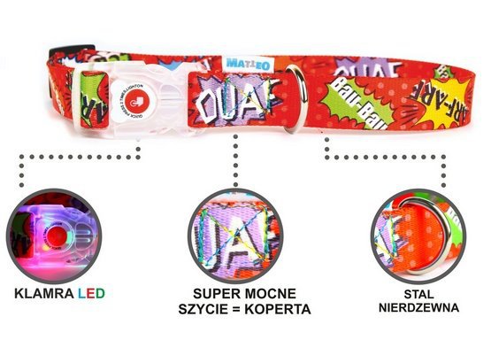 Wodoodporna obroża posiada unikatową klamrę ze źródłem światła LED w trzech kolorach i trzech trybach świecenia. W zestawie z baterią!