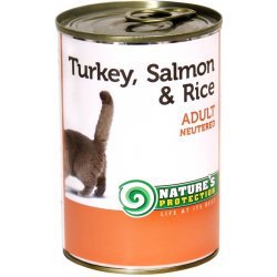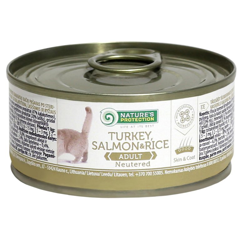 - Mokra karma Neutered Turcja, Salmon & Rice składa się z rozdrobnionego naturalnego indyka i łososia w delikatnym rosole, wzbogaconej dodatkiem ryżu i minerałów.