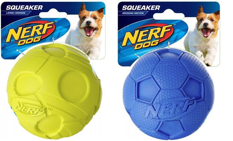 - Piszcząca piłka nożna NERF to zabawka przeznaczona dla psów, które uwielbiają gryźć i biegać.