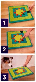Węsząc i pomagając sobie łapą lub pyszczkiem pies natrafi na przegródki, które będzie musiał odblokować, zanim sięgnie po ukryte w nich łakocie. System blokady polega na przesuwaniu ruchomych płytek znajdujących się na brzegach zabawki. Dodatkowo na środku jest obrotowe pokrętło z wnęką pasującą do okrągłych elementów również skrywających łakocie. Sprawdź czy Twój czworonóg jest geniuszem nad geniusze!