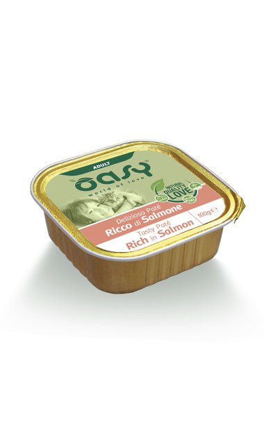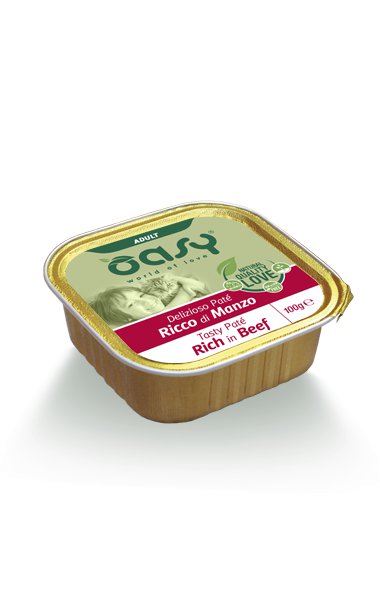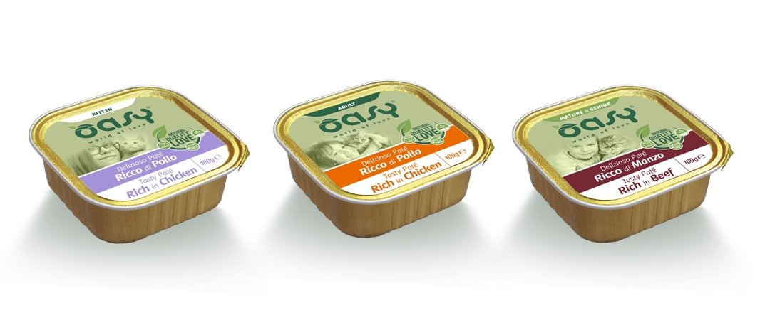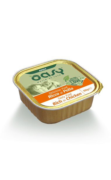 Oasy Deliziozo Pate to gotowany na parze, smaczny i pełnowartościowy posiłek. Dzięki takiej metodzie przygotowania, gwarantuje wysoką strawność i doskonały smak. Te smakowite karmy przygotowywane są z naturalnych składników, o dużej zawartości białka zwierzęcego, bez zawartości zbóż.