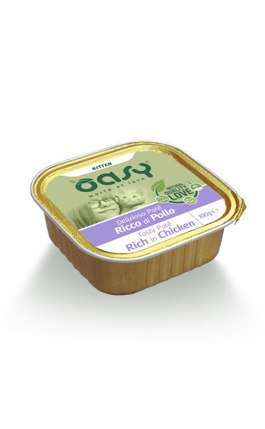 Oasy Deliziozo Pate to gotowany na parze, smaczny i pełnowartościowy posiłek. Dzięki takiej metodzie przygotowania, gwarantuje wysoką strawność i doskonały smak. Te smakowite karmy przygotowywane są z naturalnych składników, o dużej zawartości białka zwierzęcego, bez zawartości zbóż.