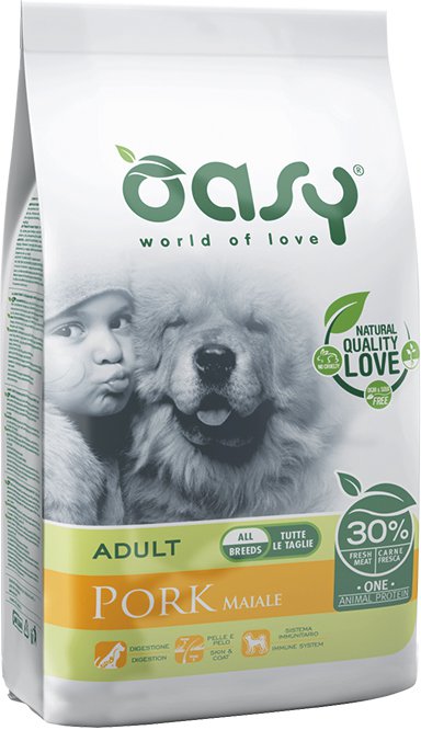 Świeże mięso wieprzowe (30%), ryż, odwodniona wieprzowina (20%), białko ryżowe, tłuszcz zwierzęcy, białko ziemniaczane, hydrolizowana wątróbka wieprzowa, wysłodki buraczane (2,5%), siemię lniane, drożdże piwne (1%), olej z ryb, chlorek sodu, chlorek potasu, inulina (1000 mg/kg, źródło fruktooligosacharydów), imbir (0,1%), mannooligosacharydy (1000 mg/kg), jukka Mojave (170 mg/kg).