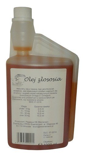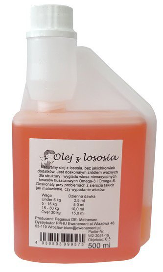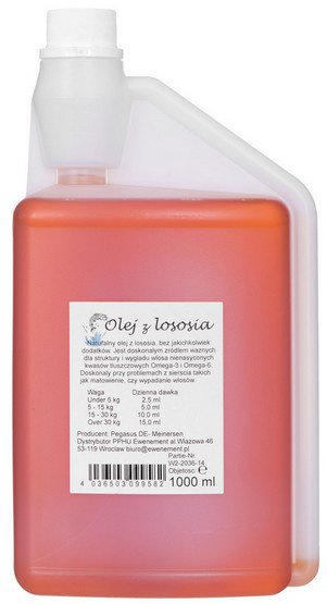 Naturalny olej z łososia, bez jakichkolwiek dodatków. Jest doskonałym źródłem ważnych dla struktury i wyglądu włosa nienasyconych kwasów tłuszczowych Omega-3 i Omega-6. Doskonały przy problemach z sierścią, takich jak matowienie, czy wypadanie włosów.