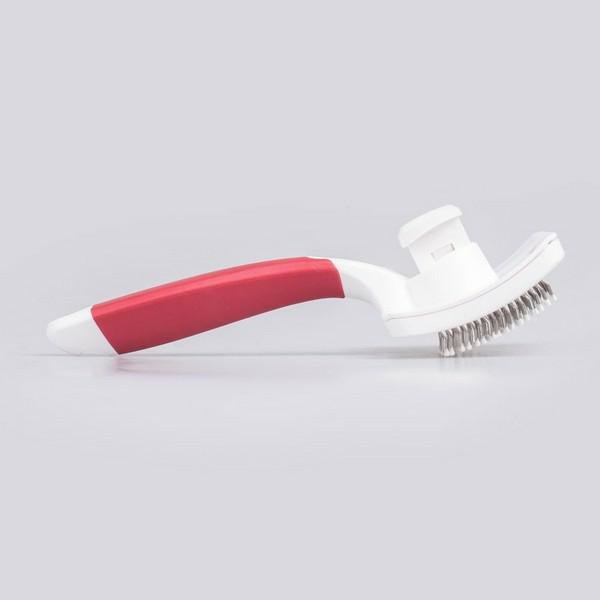 Dzięki stalowym, lekko wygiętym igłom doskonale sprawdzi się do rozczesywania splątanej sierści, kołtunów oraz wyczesywania martwego podszerstka. Mechanizm ułatwiający czyszczenie umożliwia szybkie pozbycie się zebranej sierści. Plastikowe kulki na końcach igieł zabezpieczają przed podrażnieniem skóry. Ergonomiczny uchwyt z miękkiego plastiku ułatwia rozczesywanie.