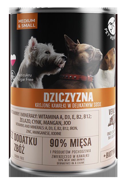 Dziczyzna to wyjątkowa pozycja w karmach dla zwierząt. Charakteryzuje się aż 3-4-krotnie wyższą zawartością tiaminy, ryboflawiny, sodu i potasu. Zawiera dużo wartościowego, bogatego w aminokwasy egzogenne białka, którego organizm zwierząt sam nie potrafi wytworzyć.