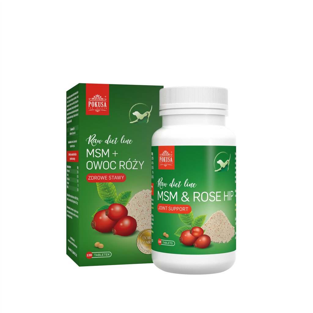 Pokusa MSM + Owoc dzikiej róży to wysoce przyswajalny, organiczny dodatek żywieniowy w postaci tabletek, który wspiera działanie i rehabilitację aparatu ruchu u psów i kotów. Produkt zawiera MSM, związek siarki biogennej pozyskiwany z miazgi sosnowej, oraz ekstrakt z owocu dzikiej róży, będący naturalnym źródłem witaminy C.