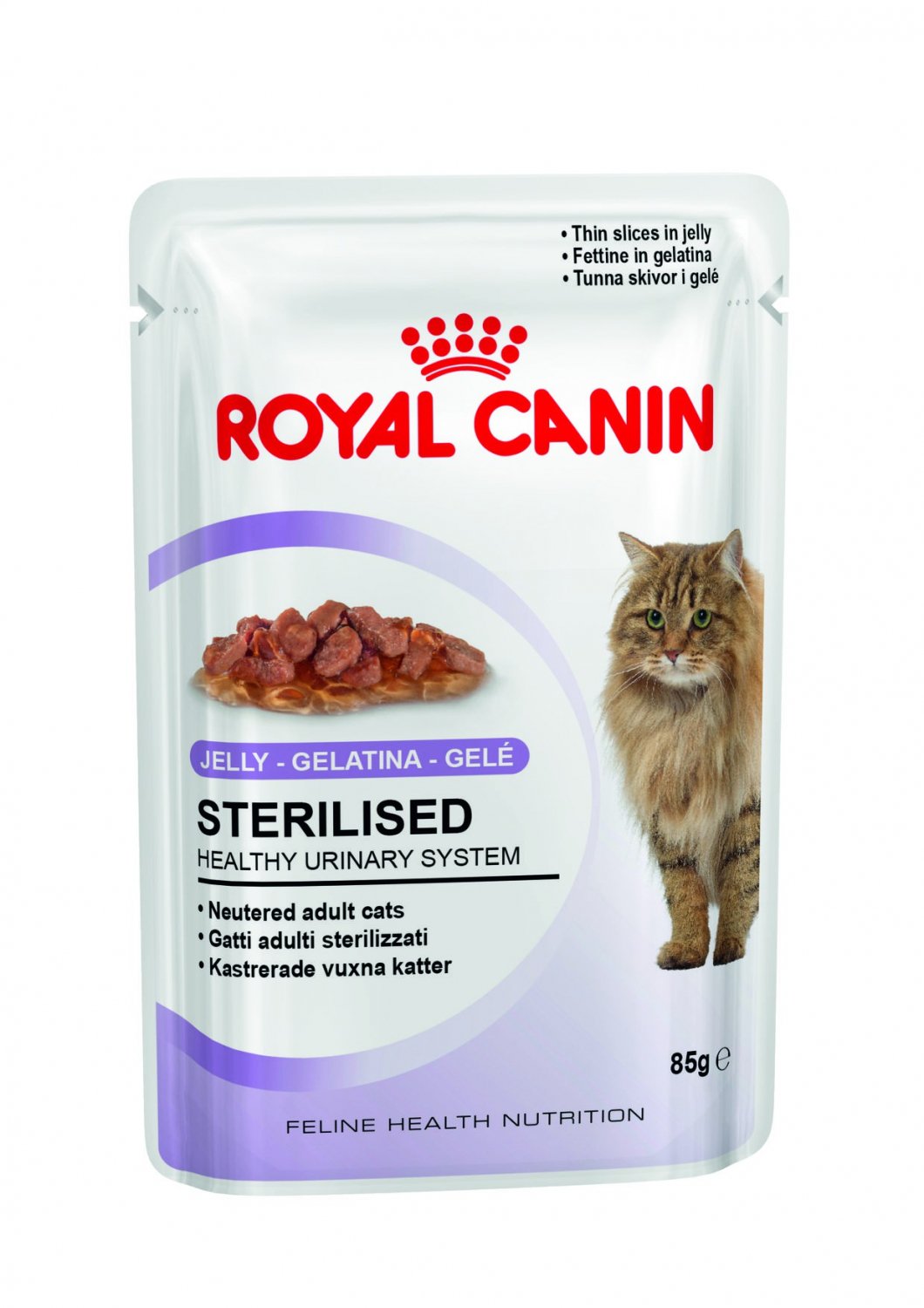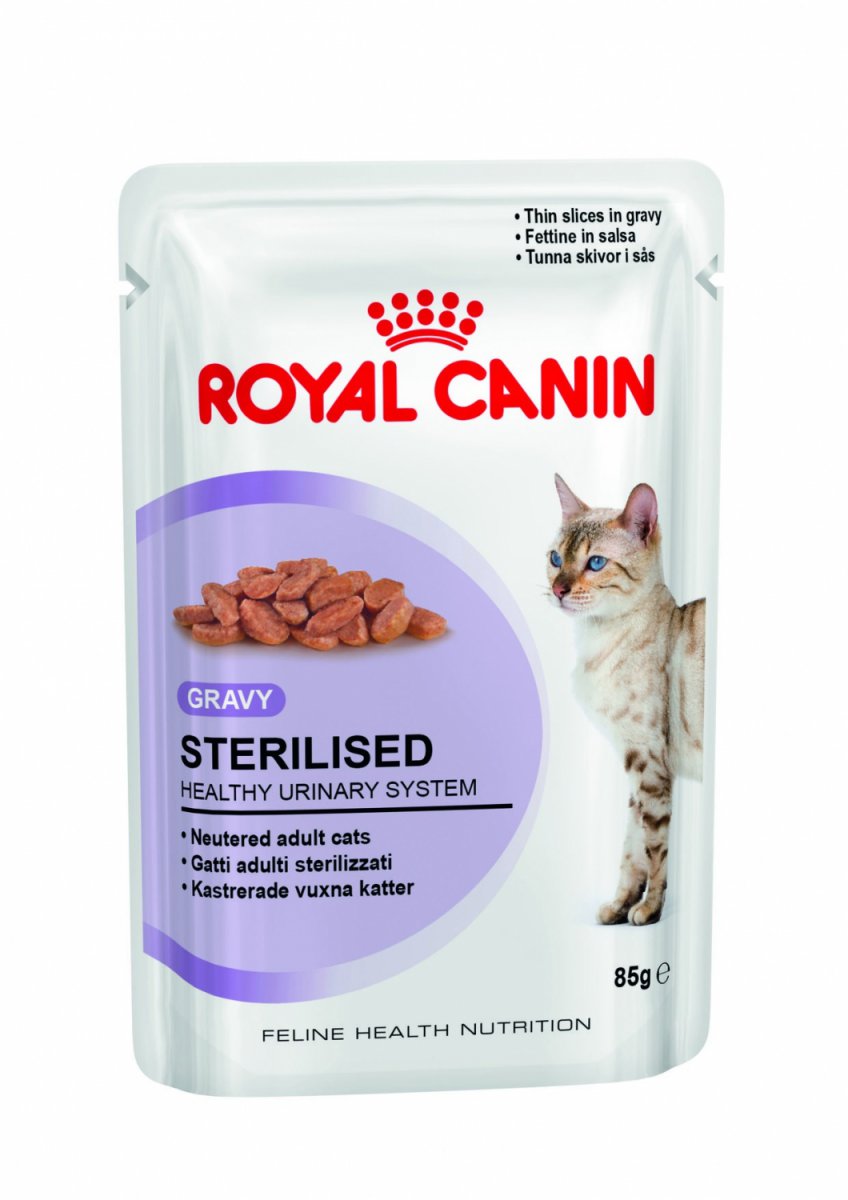 Karma mokra dla kotów po sterylizacji. Royal Canin Sterilised została opracowana dla kotów, które ukończyły już 12 miesiąc życia. Przewidziana dla zwierząt po zabiegu sterylizacji lub kastracji.Ta mokra karma skoncentrowana jest w saszetkach w trzech wariantach: sos, galaretka i pasztet. Każdy kot znajdzie odpowiednią konsystencję dla siebie. Pożywienie zostało skonstruowane, aby niwelować nadmierne przybieranie masy. Koty po zabiegu sterylizacji mają często zachwianą gospodarkę hormonalną i nadmiernie spożywają pokarm. Royal Canin Sterilised dostarcza kotu odpowiedniej ilości energii, która pochodzi z wysokiej jakości białek. Royal Canin Sterilised posiada wysokie walory smakowe. Koty z natury są mięsożerne i karma zaspokoi ich wymagania żywieniowe. Karma dla kotów po sterylizacji wspiera również układ moczowy. Posiada w swoim składzie składniki, które wpływają na pozytywne bakterie układu moczowego. Niwelują one powstawanie kamieni.