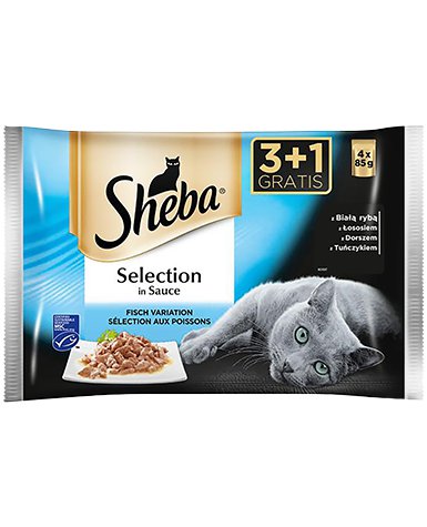 Mokra karma dla kota Sheba® Selection in Sauce Smaki Rybne to zestaw 4 saszetek o smaku białej ryby, łososia, dorsza i tuńczyka, zawierających luksusowe mieszanki najwyższej jakości kawałków karmy w delikatnym sosie. Ich pyszna receptura sprawia, że Twój koci przyjaciel będzie prosił o więcej. Sheba® Selection in Sauce Smaki Rybne to karmy pełnoporcjowe, które dostarczą Twojemu kotu niezbędnych składników odżywczych. Dostępne w wygodnych saszetkach.