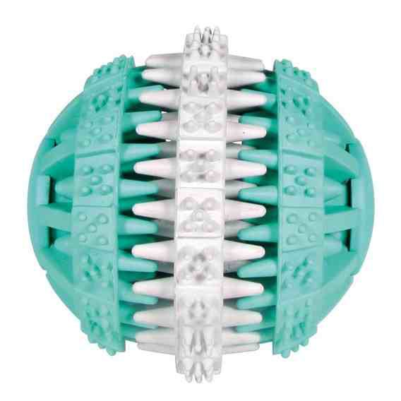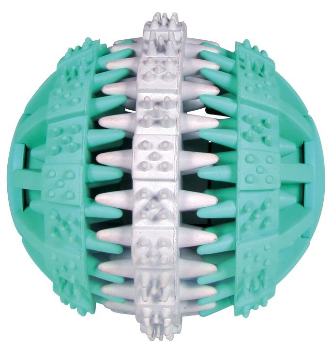 Gumowa piłka dla psów. Doskonale nadaje się jako gryzak lub do zabaw w aportowanie. Wypustki piłki czyszczą zęby psa z resztek pokarmu i delikatnie masują dziąsła. Miętowy smak odświeża jego oddech. Piłka to idealna zabawka dla psa w każdym wieku. Wykonana została z materiałów najwyższej jakości, całkowicie bezpiecznych dla zwierząt.