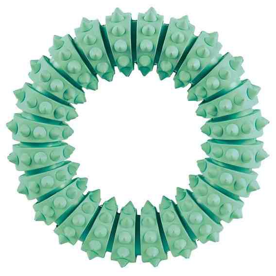Gumowy ring dla psów. Doskonale nadaje się jako gryzak lub do zabawy w aportowanie i przeciąganie. Wypustki na kole czyszczą zęby psa z resztek pokarmu i delikatnie masują dziąsła. Miętowy smak odświeża oddech. Ring to idealna zabawka dla psa w każdym wieku. Zabawka wykonana jest z naturalnej gumy, dzięki czemu jest całkowicie nietoksyczna i bezpieczna dla zwierząt.